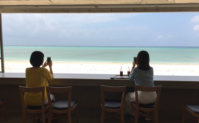 満潮時の窓際席からの撮影が“沖縄映え”の定番。